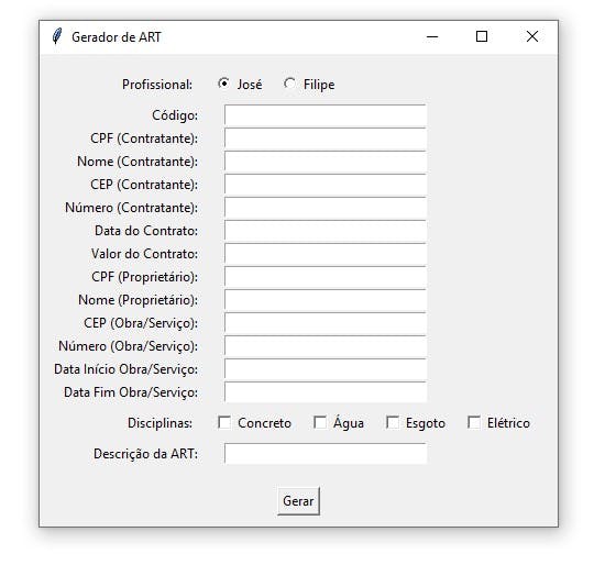A interface gráfica incluiu campos para inserir CPF, nome, endereço, datas e informações técnicas específicas da ART, além de checkboxes para selecionar facilmente as disciplinas envolvidas (como Concreto, Hidrossanitário e Elétrico) e radiobuttons para selecionar o profissional responsável pela ART.