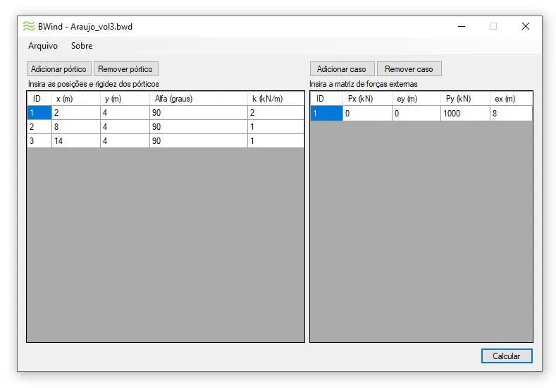 Com base em modelos matemáticos simplificados, como a representação por molas equivalentes e uso de matrizes de rigidez, o BWind calcula o deslocamento da estrutura e redistribui as forças de acordo com a rigidez de cada pórtico.